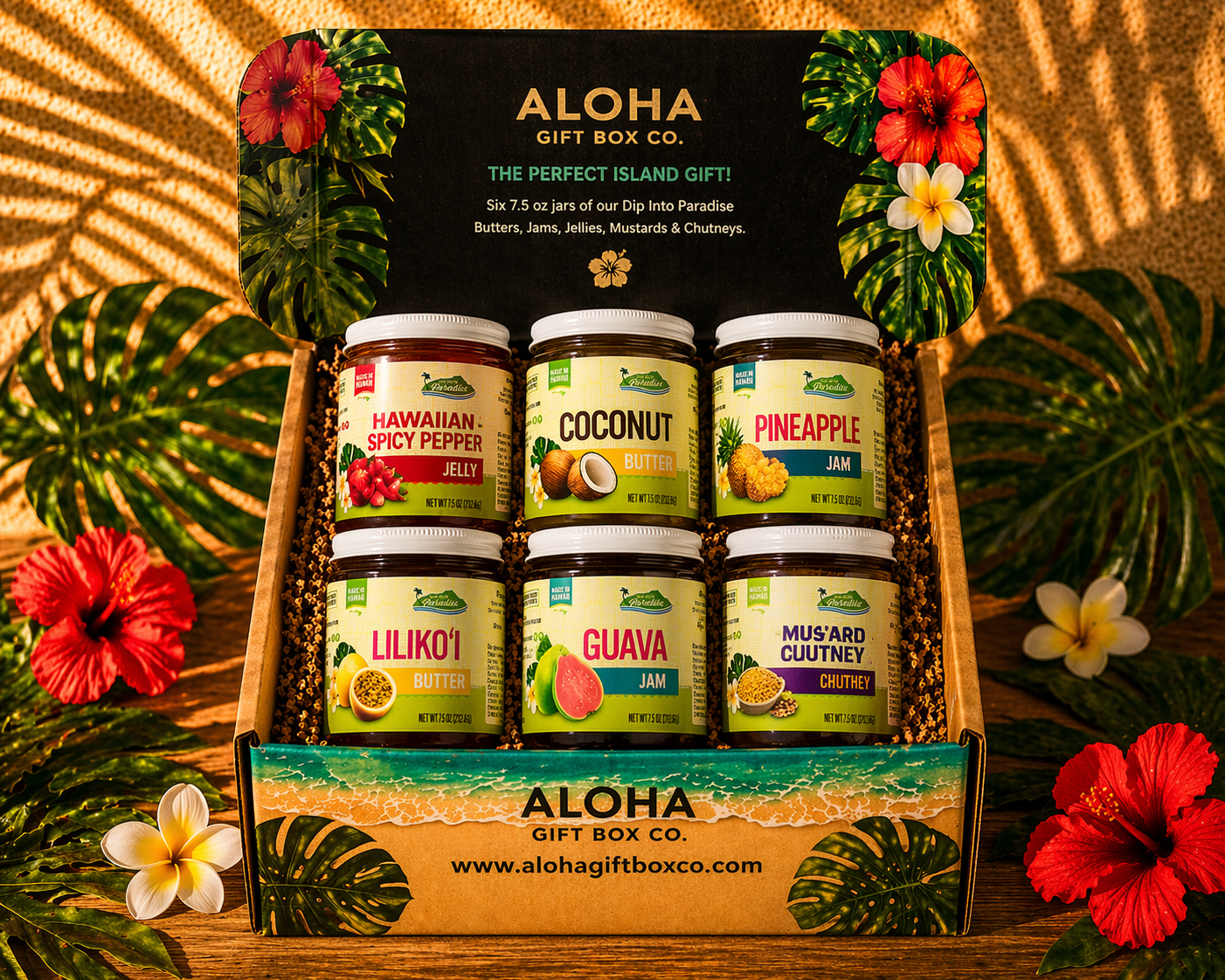 The perfect island gift! We'll mix and match six 7.5 ounce jars of our local butters, jams, jellies, mustards, or chutney. They'll arrive in our specialty box!