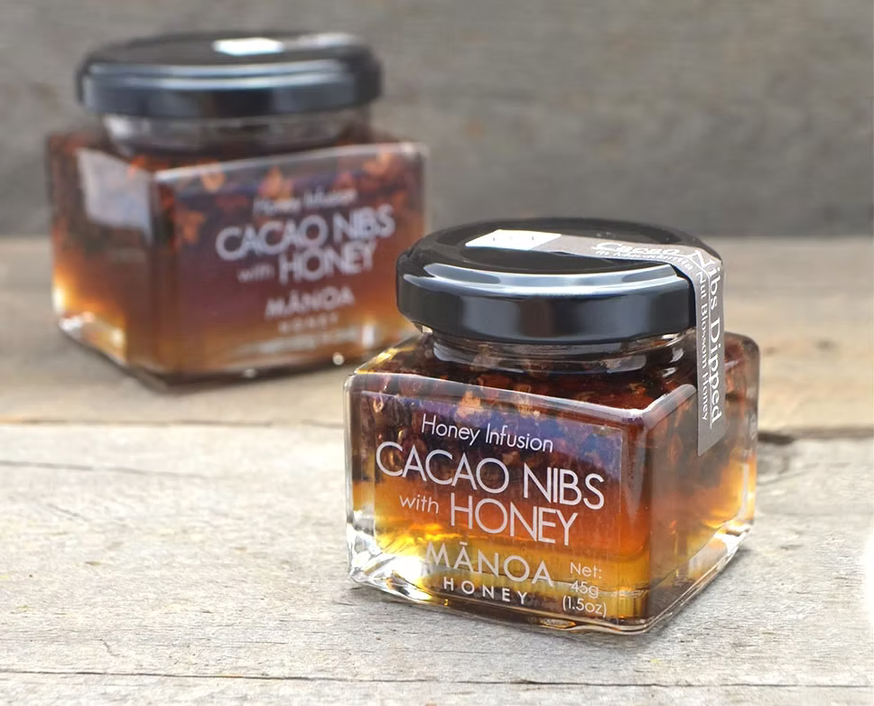 Cacao Nibs with Honey is made by dipping cacao nibs in our Macadamia Honey. It's a flavor bomb of floral, nutty honey and chocolatey cacao nibs with a crunchy texture. Drizzle it over ice cream, yogurt, toast, cheese, pancakes, butter, or anything you want for a bit of sweet, chocolatey crunch.